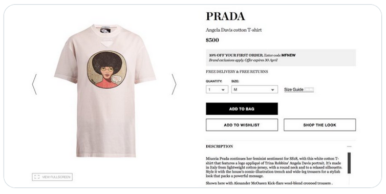 En el desfile de Dior de 2020-21 las modelos desfilan entre eslóganes feministas luminosos. En la colección de 2018 de Prada vemos el rostro de Angela Davis en una camiseta de 500 euros. La filósofa feminista también aparece en una chaqueta de 1700 euros. M. Prada dijo haberse inspirado en el deseo de cambiar el mundo especialmente para las mujeres. Davis quería cambiar el mundo pero no de ese modo. La enemiga del capitalismo convertida en un objeto de lujo. La lucha convertida en merchandising. El feminismo está de moda y el capitalismo no va a dejar escapar ese nicho de mercado.
