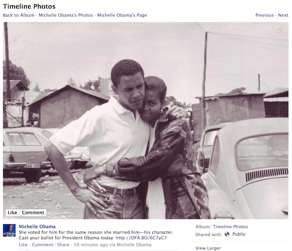Obama tiene algo de lo que carece Romney. Encara mucho mejor el sueño americano. Viene de una familia de clase media mientras que Romney es hijo de un gobernador y es multimillonario. La campaña del presidente lo explota al máximo. Estas fotos ayudan a difundir otra vez que Obama es uno de los nuestros. Un tipo supuestamente normal de orígenes normales (aunque claramente no lo es):