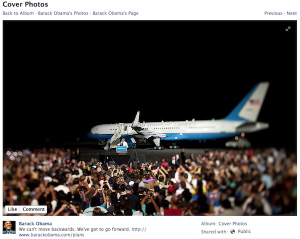 La campaña de Obama cuida más la fotografía y suele optar por fotografías profesionales. El presidente cuenta, además, con una ventaja que su rival no tiene, acceso a un 747 que aporta un cierto dramatismo a sus discursos…