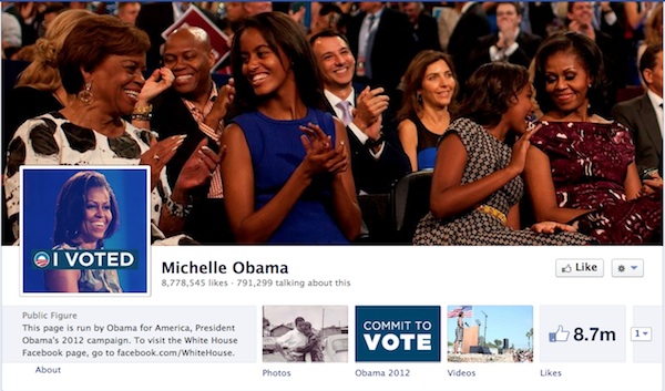 Mitt Romney acaba de superar los 12 millones de likes y su equipo ha realizado entre 3 y 6 actualizaciones diarias en los últimos meses de campaña. El diseño de su perfil en la red social es bastante sobrio y clásico, en línea con la personalidad e imagen que intenta transmitir.