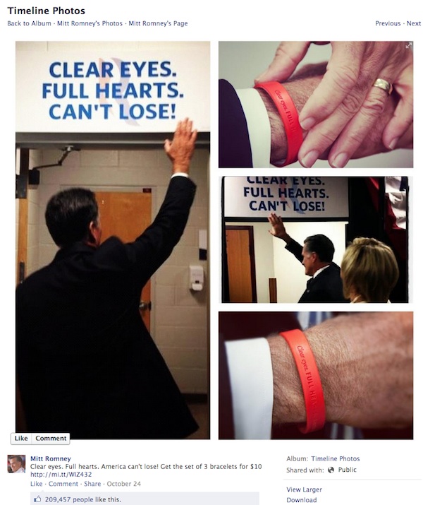 El perfil de Mitt Romney cuida poco la calidad de las fotografías. Entremezclan fotos profesionales con algunas que parecen tomadas de teléfonos móviles (probablemente lo son):