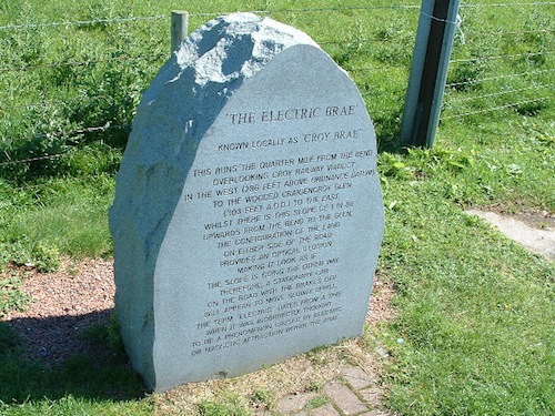5- The Electric Brae Cairn (Escocia). Esta “ladera eléctrica” se encuentra a unas tres millas (5 km) al noroeste de Maybole, y alrededor de una milla (1,5 km) al sur de Dunure, en el sur de Ayrshire. La ladera se lo nombra así por cortesía de una ilusión óptica derivada de la distribución de la tierra.