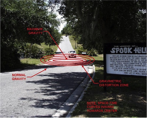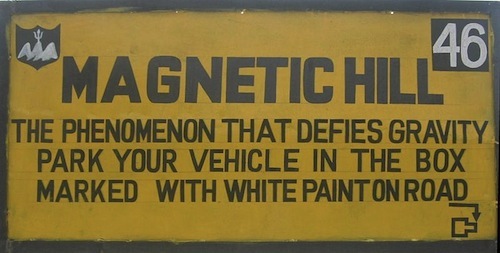 A veces uno puede encontrar un lugar misterioso donde los objetos aparentemente pueden rodar cuesta arriba. Se trata de las llamadas «colinas anti gravitatorias», también conocido como «lomas magnéticas», un lugar donde la distribución de la tierra circundante produce una curiosa ilusión óptica: una muy ligera pendiente hacia abajo parece ser una ardua pendiente hacia arriba. A veces, incluso los ríos parecen fluir contra la gravedad.