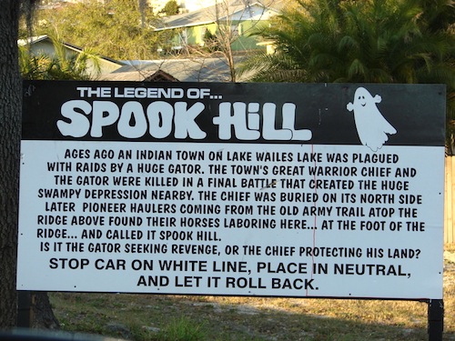 3- Spook Hill, en Lake Wales, Florida (EE.UU.). Hace casi 100 años que los vehículos aparentemente ruedan cuesta arriba. ¿El fantasma de protección de un jefe nativo americano y el caimán con el que luchó hasta la muerte, que supuestamente están enterrados cerca de aquí? Eso es lo que reza el cartel. Lo único cierto es que se encuentra junto a Spook Hill Elementary School, que adoptó la figura del misterioso fantasma Casper como su mascota.