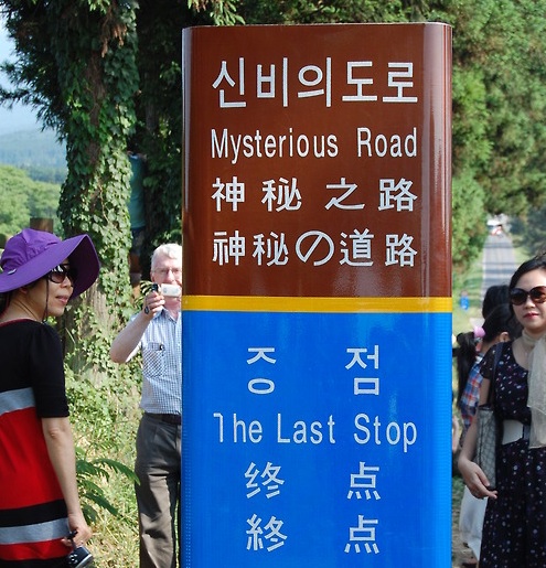 8- Jeju Mysterious Road o Dokebi Road (Corea del Sur). El tramo de árboles a lo largo de ambos lados de la carretera da la falsa ilusión de que el camino es cuesta arriba. Esta particularidad fue descubierta por un taxista de Corea hace muchos años y desde entonces se comercializa como un lugar turístico donde los visitantes sienten el truco subidos a un autobús.