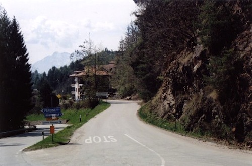 9- La «curva milagrosa» de Montagnaga (Italia). Situada a las puertas de la aldea Montagnaga, a primera vista se trata de una simple carretera asfaltada. A partir de la aldea el camino parece ser un poco cuesta abajo y, al final, hay una señal de Stop. En realidad, al pasar de la señal de parada, la ruta se inicia como un descenso y, un poco antes de la mitad del camino, se convierte en un ascenso muy fácil: esto es suficiente para mover el coche hacia atrás, pero no es evidente para la vista.