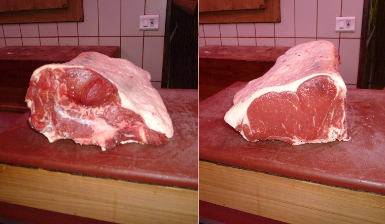 La chuleta de carnicero es la hermana fea de la chuleta de lomo bajo de ternera. Este lomo bajo tiene un principio y un final. Así que en su unión con la cadera, salen de ella unos tres filetes gorditos deliciosos, jugosos y más sabrosos que sus compañeros inmaculados del otro extremo del lomo.