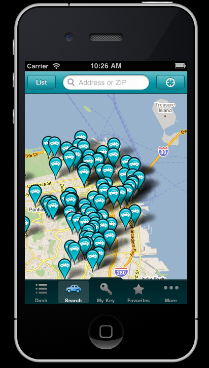 Uno de los elementos más interesantes que ofrece Getaround es su aplicación para iPhone. Con ella, además de poder ver los coches que están disponibles a tu alrededor con Google Maps, puedes abrir el coche directamente sin necesidad de recoger las llaves de antemano. Esto lo consiguen con el Getaround Share Kit, un dispositivo que el dueño del coche instala en su vehículo. Una vez dentro, la llave está en el interior del automóvil.