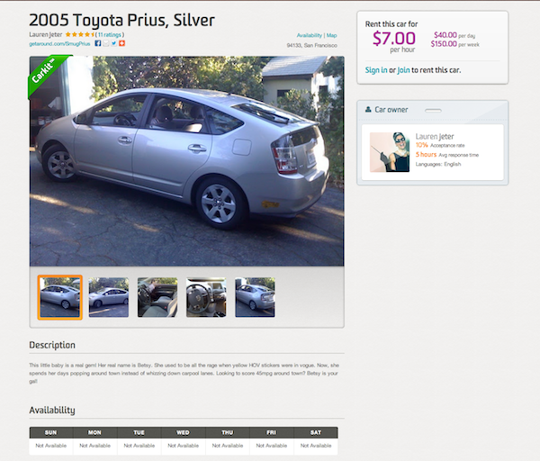 A modo de ejemplo, el Prius del 2005 de Lauren Jeter está disponible en Getaround a 7 dólares la hora, 40 dólares al día y 150 dólares la semana.