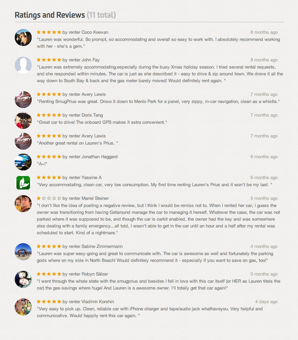 Actualmente hay unos 10.000 coches disponibles para arrendar en la web en San Francisco, Portland, Austin y San Diego. «Entre ellos algunos deportivos como el Tesla Roadster y el BMW Z4», dice la emprendedora. El dueño gestiona su propio perfil, pone los precios y marca la disponibilidad de su automóvil en una agenda. «El propietario mantiene el control total sobre su coche y solo lo alquila cuando el quiere».