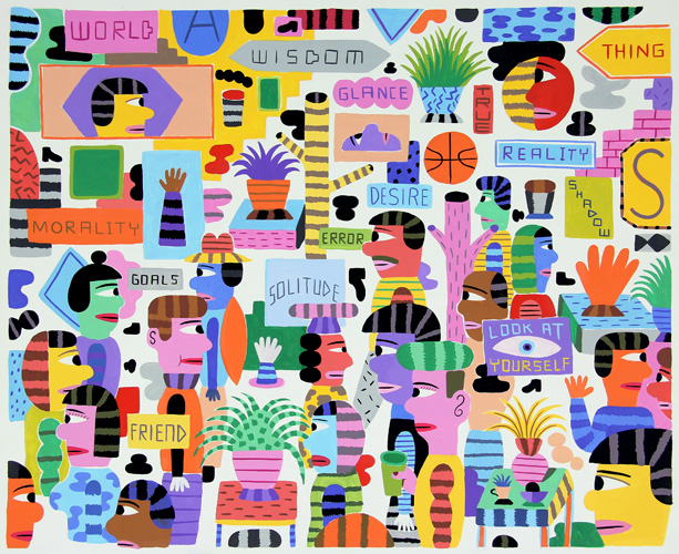 Las justificaciones de por qué Andy Rementer pinta así no solo se hallan en un arte remoto. Dice que durante una estancia en Italia se sintió invadido de inspiración. También algo de los personajes que diseña para sus proyectos de animación, sus cómics, sus dibujos y sus pinturas procede de su hermano mayor. De pequeño, copiaba sus ilustraciones y dibujaba hasta la perfección las tortugas ninja y otros personajes de dibujos animados. Fue entonces cuando aparecieron las figuras extrañas y cuando el estadounidense comenzó a fijarse en los individuos de la calle. Después descubrió que en el tren o en un café se hallaban los protagonistas de sus dibujos. Solo tenía que exagerar sus rasgos para construir “un mundo visual inusual o imposible”. La realidad, tal como es, vuelve a esta conversación y, otra vez, para Rementer, no aporta nada.
