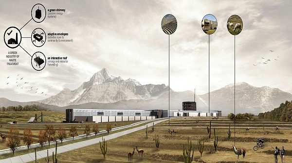 En el plano arquitectónico, el proyecto plantea el diseño de una gran planta de tratamiento de residuos orgánicos e inorgánicos que dará servicio a toda la ciudad. Un edificio autosuficiente energéticamente, con muros construidos con el material sobrante de las canteras, con paneles fotovoltaicos, y paredes hechas de planchas metálicas perforadas capaces de filtra el aire, crear sombra y regular la temperatura interior. “Será una fábrica, pero queremos transformar la típica imagen de lo que es un edificio industrial en un edificio sostenible, limpio, socialmente responsable y eficiente en términos ambientales”.