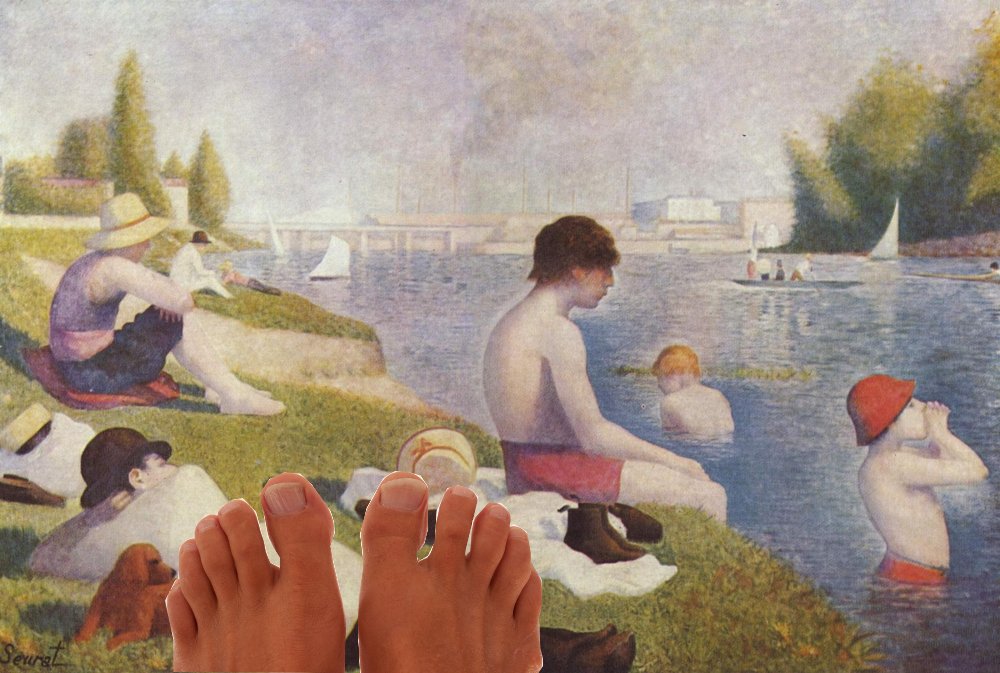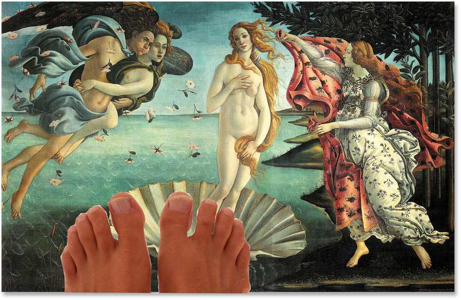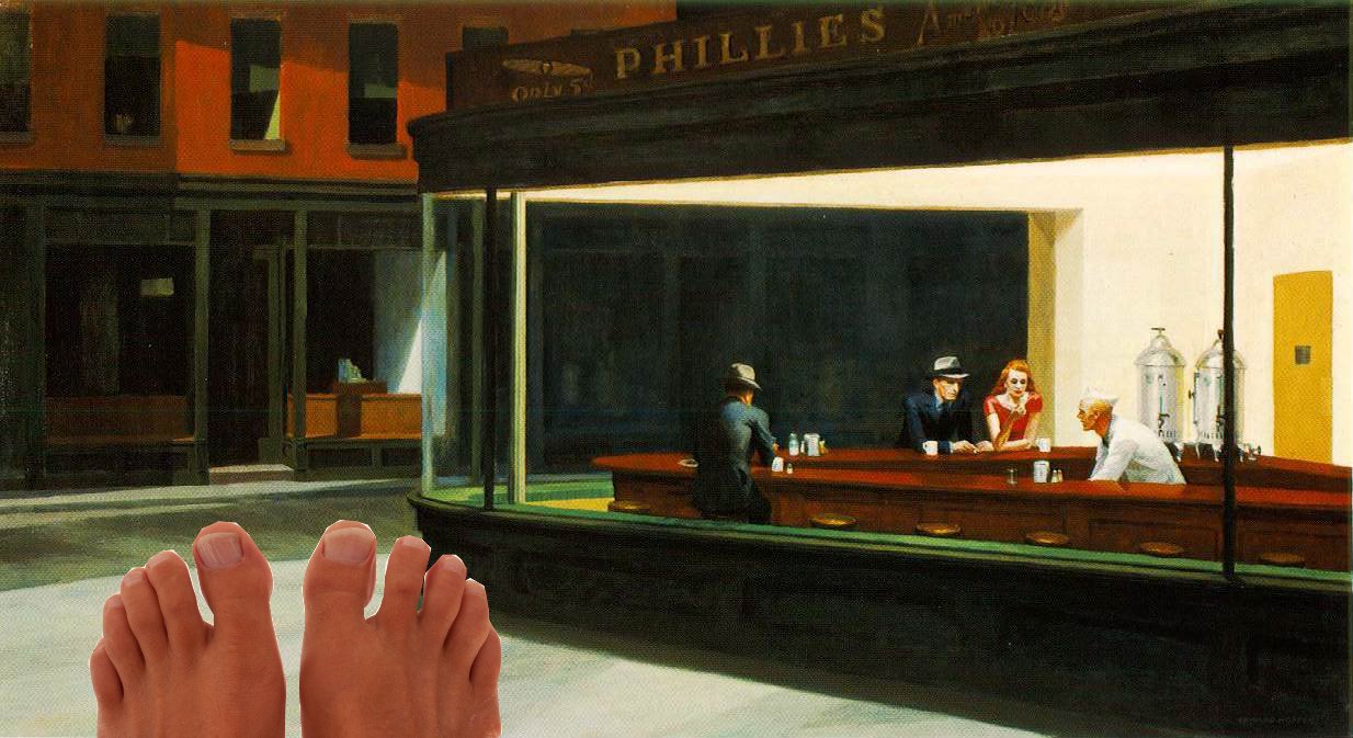 De manera que los pies en Nighthawks, la conocida obra de Hopper, parece la fotografía de un camillero que conduce a un muerto hasta la ambulancia. Por otro lado, El nacimiento de Venus de Boticelli, un espectáculo presenciado por un dominguero.