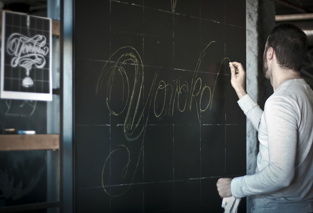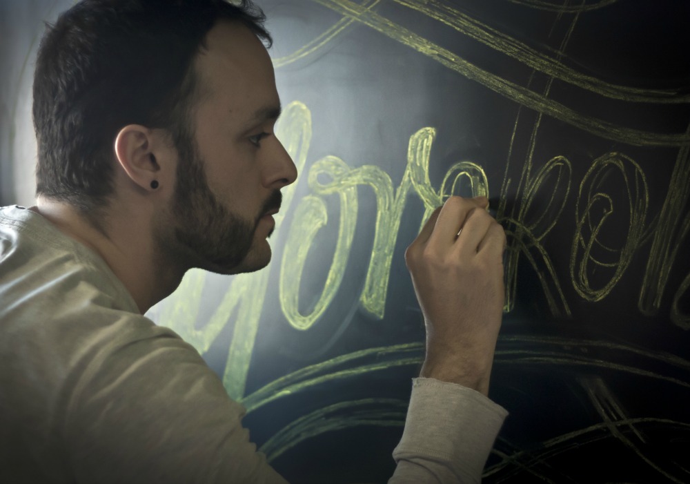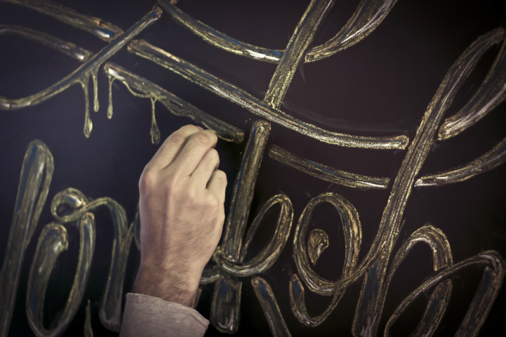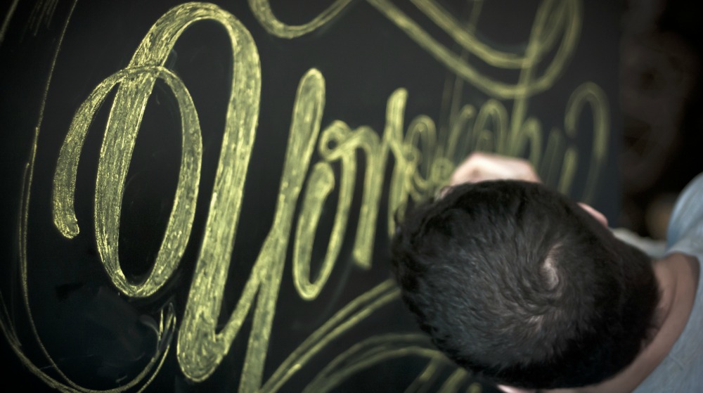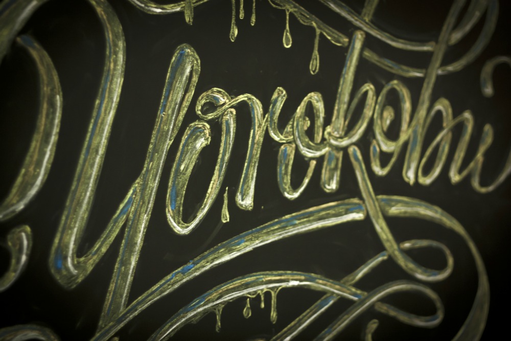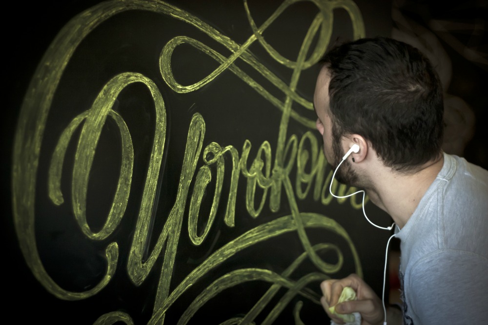 Empezó el boceto en un papel. Utilizó rotuladores y dejó las tizas para el momento final. Usó una mesa de luz para mejorar las letras y decidió añadir una ilustración. “Quería recordar a los antiguos calígrafos que creaban bellos textos partiendo de una pluma y un bote de tinta. Así surgió la idea de esta portada”, cuenta el ilustrador, rotulista y calígrafo venezolano. “Dediqué unas 7 horas al boceto y unas 8 horas a trasladarlo a la pared-pizarra”.