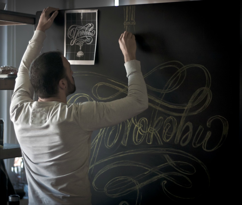 Empezó el boceto en un papel. Utilizó rotuladores y dejó las tizas para el momento final. Usó una mesa de luz para mejorar las letras y decidió añadir una ilustración. “Quería recordar a los antiguos calígrafos que creaban bellos textos partiendo de una pluma y un bote de tinta. Así surgió la idea de esta portada”, cuenta el ilustrador, rotulista y calígrafo venezolano. “Dediqué unas 7 horas al boceto y unas 8 horas a trasladarlo a la pared-pizarra”.