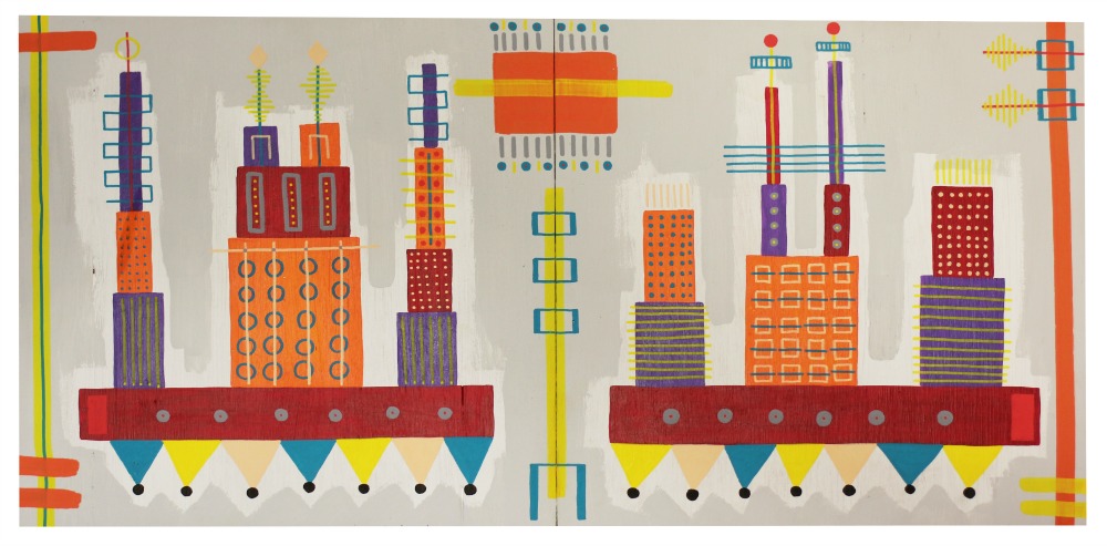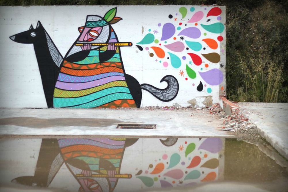 «La paleta de color canaria, la luz de mi tierra, las texturas de allí». Octavio hace tres años se trasladó a Barcelona para estudiar arte y diseño, pero su origen canario sale a relucir a los pocos minutos de charla, así como la fuerte influencia que en él ejerce. «No puedo describirte el estilo. Hago lo que me sale; y aunque intento desarrollar un lenguaje propio me ha ocurrido que diez personas miren la misma obra y las diez acaben interpretando cosas diferentes». Octavio suele usar maderas y tablones que encuentra en la calle como base para sus obras. Para el Cons Space 001 ha tenido que acostumbrarse a otras medidas. «Trabajar en espacios abiertos como este es difícil para mí. Estoy acostumbrado a medidas más pequeñas. Pero ha sido una experiencia muy guapa. De un sitio abandonado han hecho un lugar con mucho feeling, donde por la mañana todos trabajábamos en lo nuestro, los obreros montando, los artistas pintando, y luego nos reuníamos todos a comer».