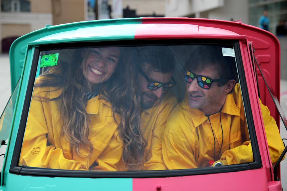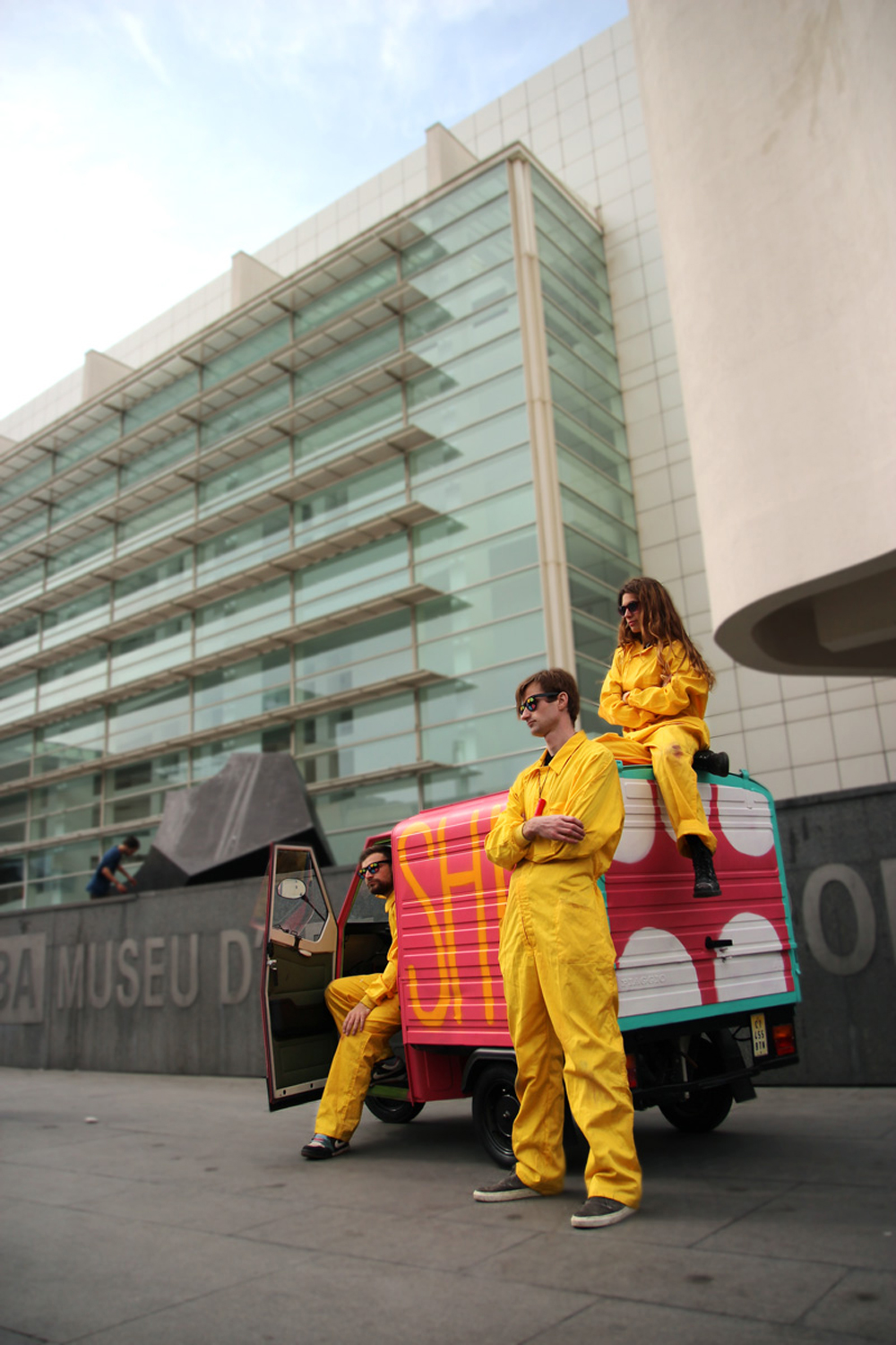 En esta primera edición de “obras de arte”, como ellos las denominan, además de las camisetas, han remodelado una furgoneta de tres ruedas. “Es una especie de moto o coche que realmente es muy shit. Solo tiene cinco años, alcanza un máximo de velocidad de 28 km/hora y, cuando quieres ir marcha atrás, has de salir del vehículo y empujar. Le dimos una capa de pintura nueva, con un spraypaint que nos cedió Montana Colors, fuimos a pasear con ella por las calles de Barcelona y al público en general le encantó: cool”.