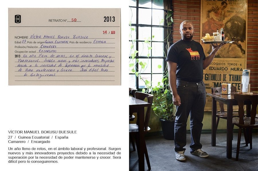 Como decíamos, cada uno de los protagonistas completa a mano una ficha en la que se identifica y expresa sus deseos para el año o su opinión sobre la situación actual, lo que aporta un punto más de autenticidad a su retrato, lo humaniza y, como Rafael nos comenta, le da voz. “Los retratos no dejan de ser nuestra interpretación subjetiva del personaje que tenemos frente a la cámara. La ficha supone añadir un lugar en estos retratos en el que cada persona se defiende con su puño y letra. Deja de ser un trabajo con dos voces, las nuestras, y se convierte en un relato con 258 voces más. Cada conjunto de retrato y ficha se convierte así en una pequeña historia; imagen y palabra se unen para darnos una idea mucho más aproximada sobre el personaje de que se trate. La decisión de que la ficha sea manuscrita es desde nuestro punto de vista todo un acierto, pues además de proporcionar mayor veracidad al documento, nos deja entrever sutilmente rasgos de la personalidad o la educación del que la escribe”.
