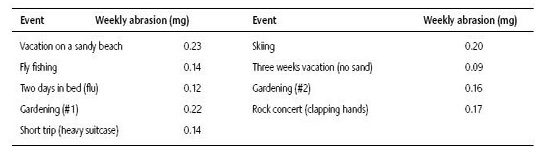 Y eso sin contar con las personas más nerviosas o infieles, esas que tiran la media hacía arriba por andar todo el día enroscando y desenroscando alianzas de casados. Aún así, la abrasión más alta que pudo observar este investigador se produjo en el curso de sus vacaciones en la playa, donde obviamente la fricción con la arena aumentó la pérdida. La jardinería y el esquí también parece que dan lugar a mayor desgaste.