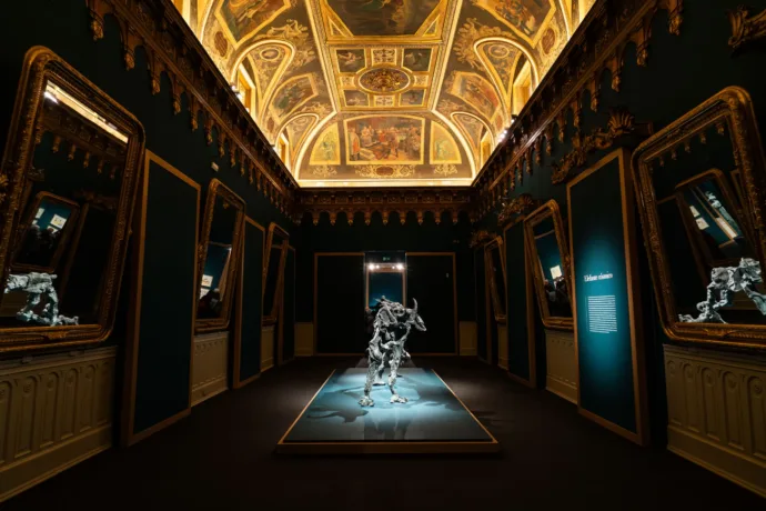 El propio Palacio de Gaviria intensifica el efecto de la muestra. Recién rehabilitado, el edificio deja de ser un simple contenedor para convertirse en contrapunto. Su barroquismo decimonónico —techos ornamentados, salas cargadas de historia— parece, en principio, chocar con el simbolismo inquietante de las piezas. Y, sin embargo, en lugar de anularse, ambas partes se tensan y encuentran un equilibrio inesperado y sorprendente.