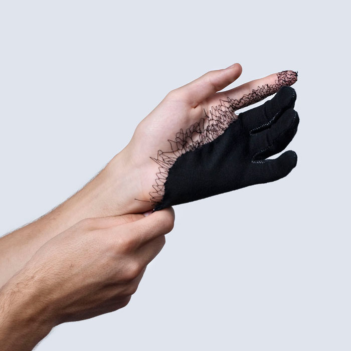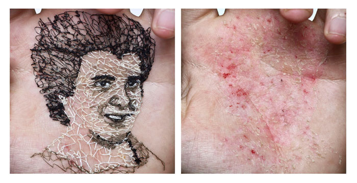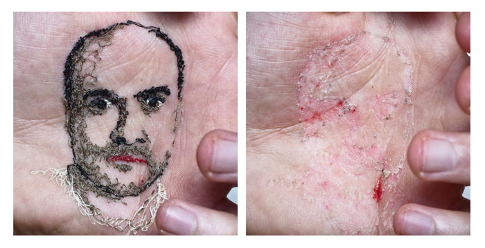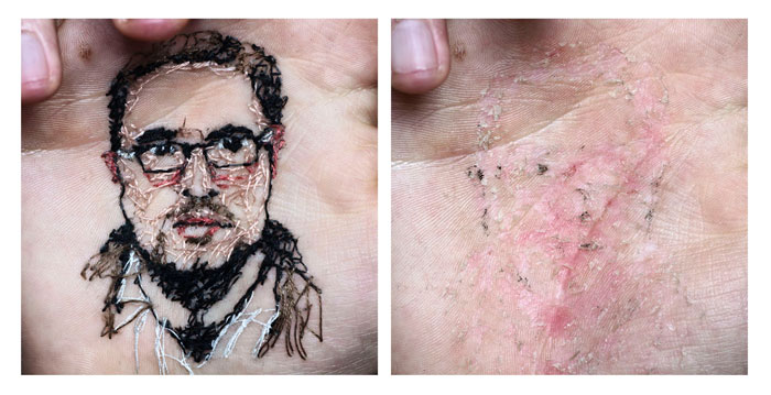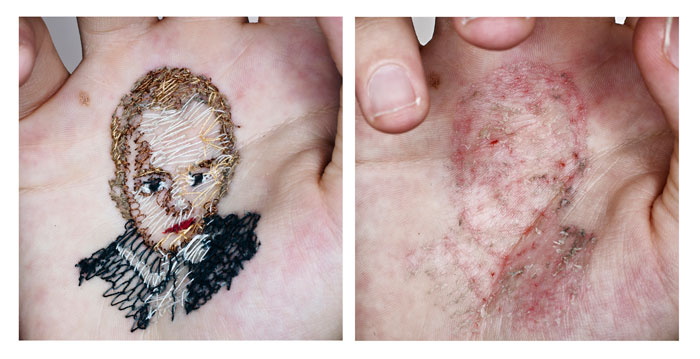 La primera vez que tomó su piel como campo de experimentos estaba aún estudiando. Tenía que hacer un proyecto de fotografía con un guante y decidió coserlo a su propia mano. Era la primera aguja que atravesaba su piel. Descubrió que no dolía y que la cicatriz se borraba en unos días. El punzón no daba miedo. «No duele nada. Impresiona porque ves una aguja, pero solo afecta a la epidermis. Es la capa más superficial de la piel», dice. «En todo caso, puede haber algo de sangre o escocer un poquito. Pero no importa. Es un acto de cariño».