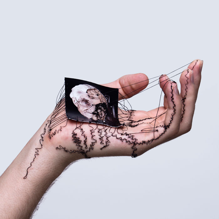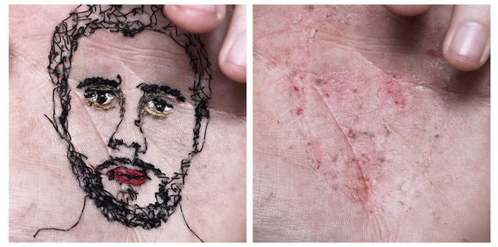 David Catá cose en sus manos el afecto que siente por las personas importantes de su vida. El fotógrafo hace de sus palmas un lienzo. Ahí introduce aguja e hilo hasta que se convierte en semblante. La marca de esa persona queda, literalmente, en su cuerpo. Para que no escape nunca. Para sellar esa afición con más ahínco del que lo haría un recuerdo. Después toma fotos, hace vídeos y, a veces, muestra en una representación pública cómo se deshace el dibujo entre lo humano y la costura que queda de la confección. «Es una performance para mostrar las huellas que dejan algunas personas en mí», indica.