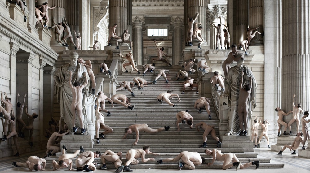 Tanto las fotos como los vídeos muestran una multitud de cuerpos. Sin embargo, son solo los de los dos artistas multiplicados digitalmente. De ahí que solo haya hombres en las imágenes.