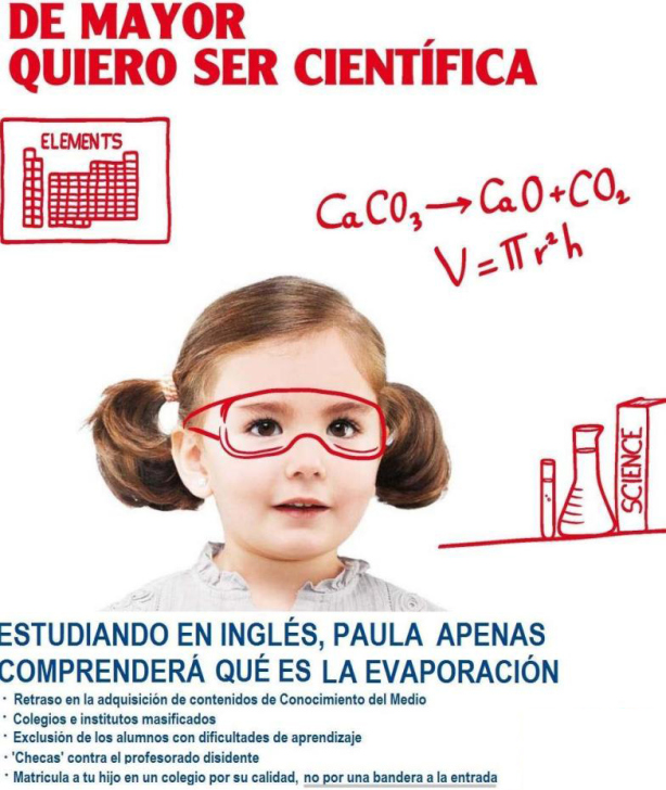 Según un estudio de 2013 elaborado por la Fundación de Estudios de Economía Aplicada, existen problemas al aplicar este enfoque a áreas como Conocimiento del Medio, la asignatura que en Primaria agrupa Ciencias Naturales, Geografía e Historia, pero no a Matemáticas y Lectura. No resulta tampoco una sorpresa su conclusión de que este efecto empeora en los alumnos cuyos padres tienen un bajo nivel educativo. Esta postura se resume muy bien en un cartel creado por las plataformas en defensa de la enseñanza pública de Madrid. En él, aparece una niña con unas gafas de laboratorio pintadas con una leyenda debajo: «Estudiando en inglés, Paula apenas comprenderá que es la evaporación».