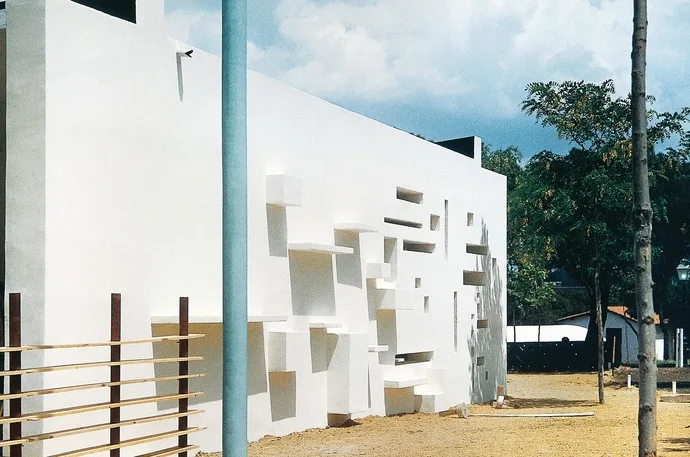 El conjunto se organizó a partir de una gran plaza circular, con patios y recorridos abiertos al paisaje. Era un urbanismo humanista, que entendía la arquitectura como escenario de encuentro social. En aquel primer recinto, los pabellones eran casi prototipos de un lenguaje moderno, radicalmente distinto a los estilos oficiales de la época. Frente a la monumentalidad retórica del régimen, se proponía una arquitectura serena, honesta y constructiva, basada en la lógica del material y la proporción.