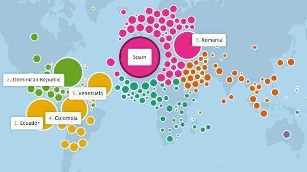 A otras ‘relaciones’, en cambio, las ha encontrado sentido una vez completada la investigación. “Entendí la fuerte conexión entre Japón y Brasil debido a los flujos migratorios que se establecieron entre los dos países en la década de los 70”. La misma explicación encuentra al enorme número de relaciones entre Polonia e Islandia (la comunidad polaca supone el primer grupo de inmigrantes en este último país). Y lo mismo valdría para explicar por qué Ecuador, Rumania o República Dominicana son los países en los que los usuarios españoles tienen más amigos de Facebook.