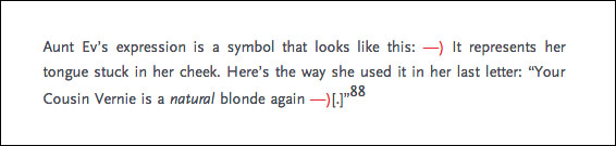 Medio siglo después un columnista estadounidense volvió a hablar de los signos de puntuación para representar gestos humanos. En 1967 Ralph Reppert relató en el Sunday Sun de Baltimore: «Mi tía Ev es la única persona que conozco que puede escribir una expresión facial». El libro Shady Characters: The Secret Life of Punctuation, Symbols, and Other Typographical Marks, de Keith Houston, recoge el párrafo donde el autor explica cómo su tía Ev representaba estos gestos.