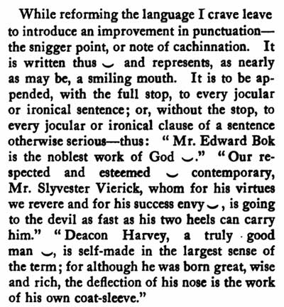 En la obra, Bierce propone «introducir una mejora en los signos de puntuación» para representar la sonrisa, según Twittergrafía. El arte de la nueva escritura, de Mario Tascón y Mar Abad (Disclosure: la autora de este artículo es coautora del citado libro).