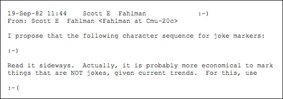 La escritura en internet supuso la generalización de los emoticonos tal y como los conocemos hoy [ :-0 :-I 🙂 ]. El impulso definitivo se atribuye a la propuesta que hizo el informático estadounidense Scott E. Fahlman en un mail que envió al tablón de anuncios electrónico de su universidad, Carnegie Mellon University, el 19 de septiembre de 1982.