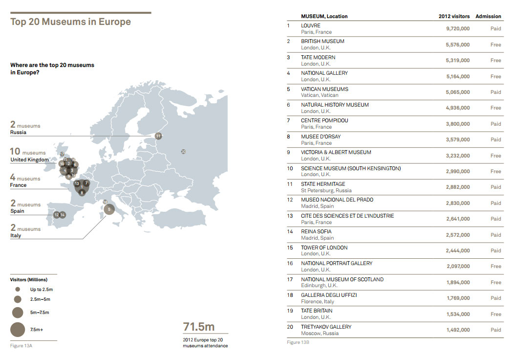 Hablando de ocio siempre nos quedarán, en fin, los museos. En esa disciplina tenemos dos representantes en el top 20 europeo, con el Museo del Prado en duodécimo lugar, con 2,8 millones de visitantes anuales, y el Reina Sofía dos puestos más abajo, con 2,5 millones.