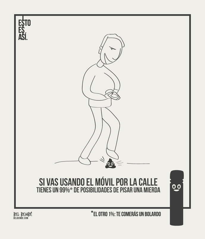 «Me preguntaba qué pensarían ellos que pienso yo cuando los veo», cuenta Bel Bembé. «Hice una viñeta para mis amigos y la colgué en FB sin ninguna pretensión». Pero el dibujo llegó mucho más lejos de lo que la diseñadora podía imaginar. Pasó por casi mil muros y la animaron a hacer más. Fue el pasado mes de mayo y el paseo se produjo entre dos barrios céntricos de Madrid.