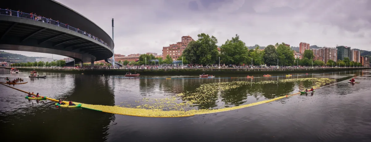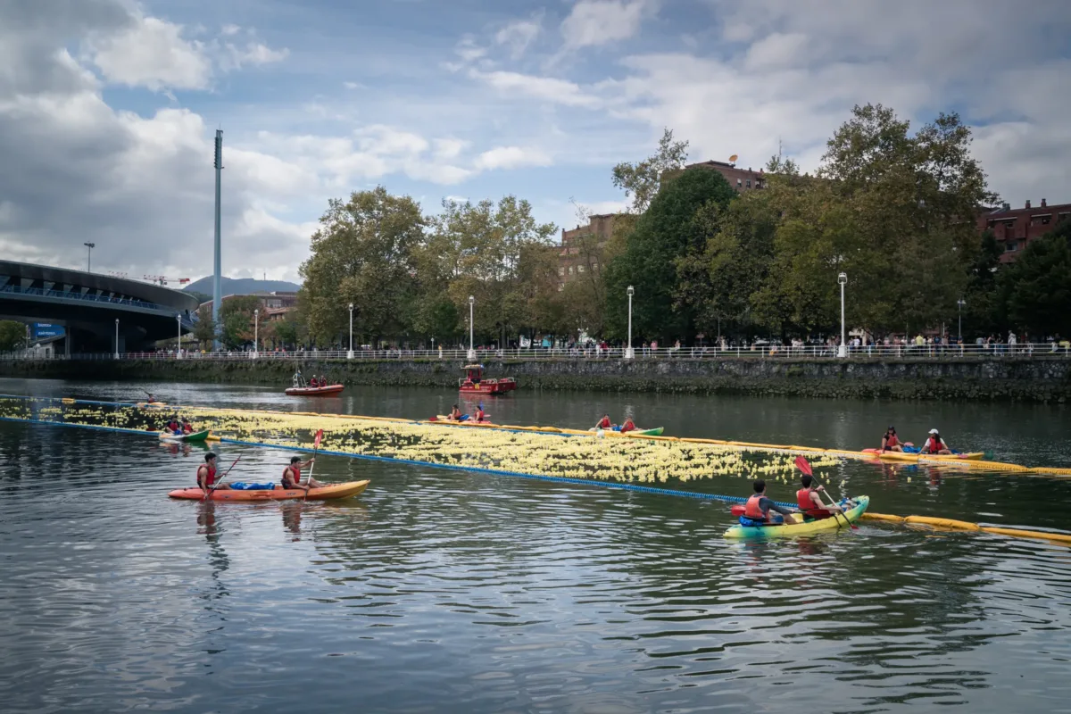 La Estropatada es, precisamente, un reflejo claro de esos valores. Aunque es un evento pensado para recaudar fondos y difundir la conciencia sobre las enfermedades neurodegenerativas, el ambiente que crea en Bilbao es festivo, con miles de personas que se acercan a la orilla de la ría a ver la marea amarilla de patos que avanza poco a poco al ritmo de la corriente. «Se ha convertido en un evento de ciudad», afirma Renteria, «es un día bonito de vivir: hay gastronomía, música, se generan imágenes especiales». Al ser ya la 13ª edición, el responsable de WOP subraya que hay generaciones jóvenes que han crecido con la Estropatada.