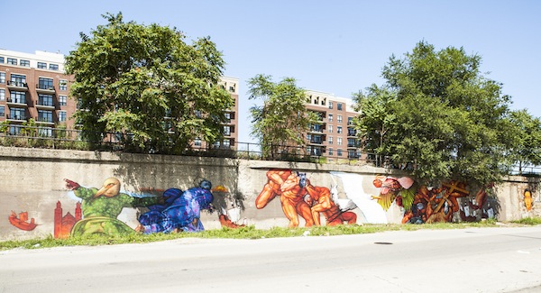 Gaia busca jugar con el entorno donde trabaja. Estudia las paredes donde va a pintar o colocar sus dibujos, habla con la gente del barrio y trata de hacer siempre algo relacionado con ellos. La semana pasada pasó por Chicago para pintar un par de paredes. Una en Ukranian Village y otra en Pilsen, el barrio mexicano, donde hizo un enorme mural con una mezcla entre mitología y la conquista del ya no tan nuevo continente.