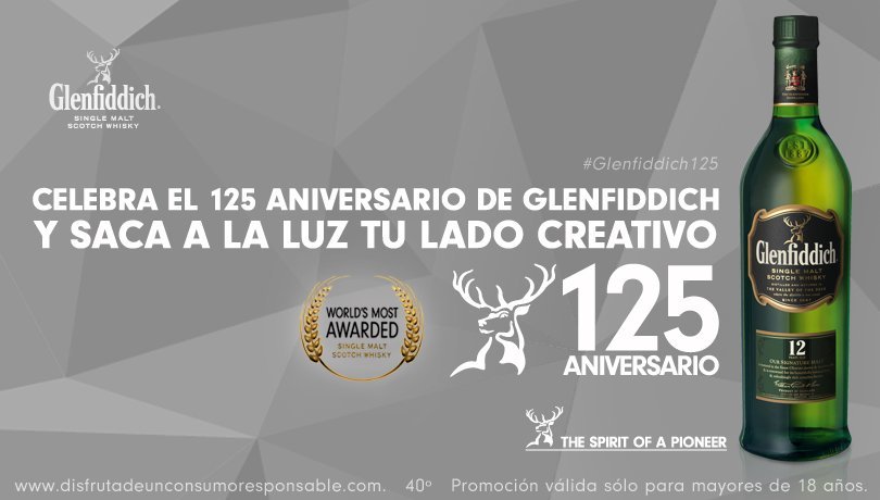 El resultado de tu creación será presentado junto con obras de diferentes artistas. El evento de 125 aniversario tendrá lugar próximamente donde cualquier interesado podrá admirar y adquirir las obras. Además, serás premiado con una botella de Glenfiddich 21 años que se te entregará durante el evento al que, por supuesto, tendrás acceso junto con tu acompañante presentando tu invitación doble que Glenfiddich te hará llegar por ser el ganador de esta promoción.