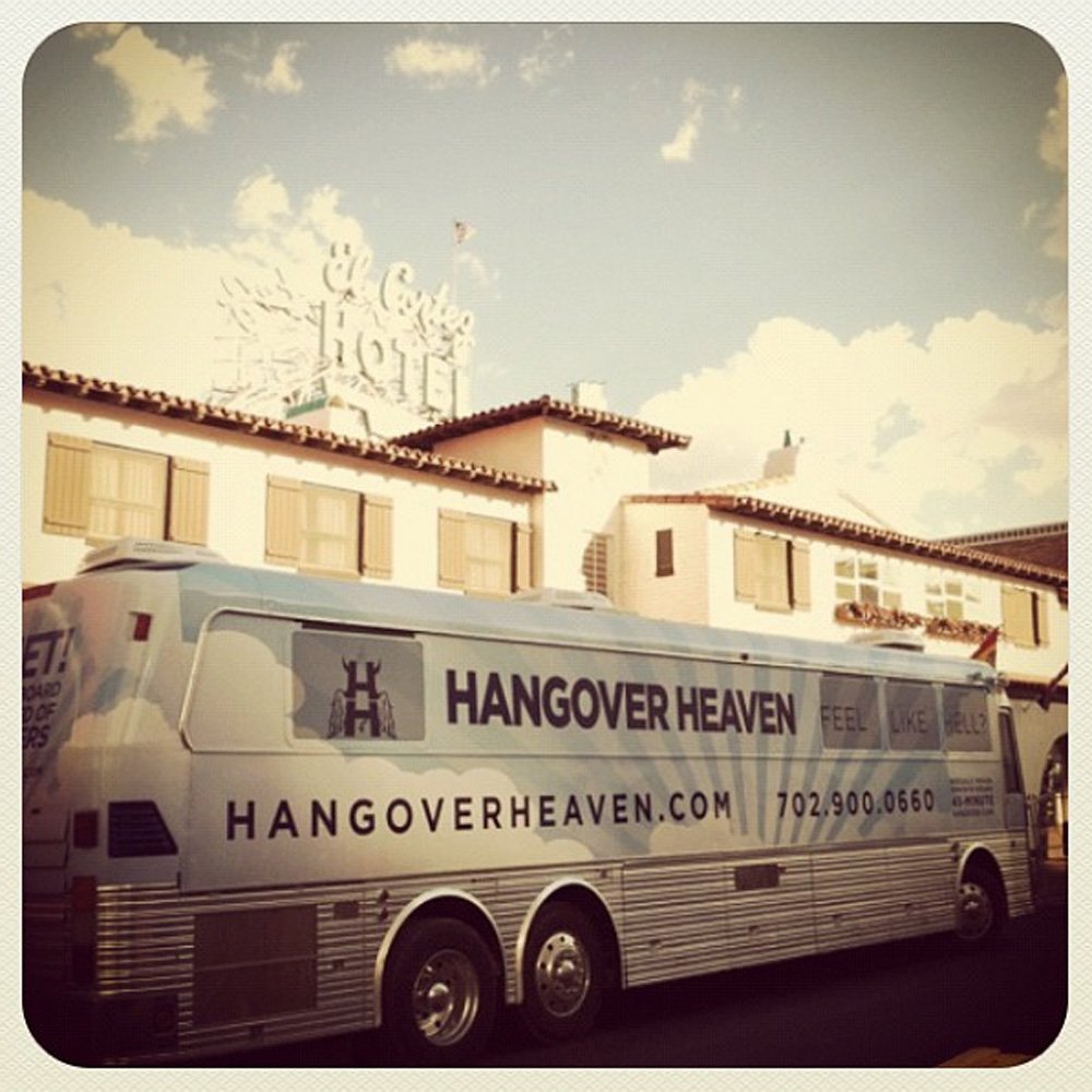 Una de las estrellas del negocio es el Hangover Heaven Bus, una clínica rodante en la que giraba una banda de gospel en una encarnación anterior, y cuyo alquiler cuesta 1.500 dólares la hora; tiene capacidad para administrar hasta 10 tratamientos por hora e incluye café, Gatorade, snacks, televisión y wi-fi. En un estilo típicamente americano, la compañía vende camisetas, gorras e incluso chupitos de tequila conmemorativos (una buena resaca siempre debe concluir con la promesa de un nuevo pedo).