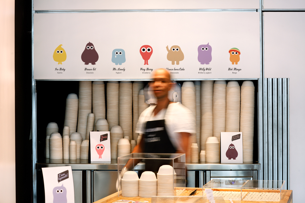 “El helado era tan feo que decidimos hacer de ello una virtud”, dice Marion Dönneweg, fundadora junto con Merche Alcalá de M Barcelona, estudio responsable de este proyecto. Todo comenzó con un proceso deconstructivo: primero, separar los toppings (mermeladas, chocolate líquido, dulce de leche, etc), y después, a esa montaña de helado deforme le pusieron dos ojos de azúcar. “Convertimos el helado en un personaje, un pequeño monstruo que te mira a los ojos y que le dota inmediatamente de vida y personalidad”.