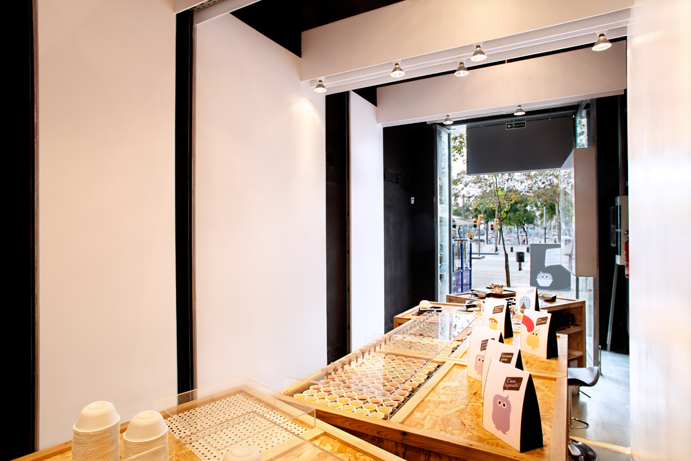 Su fachada cambiante y multifuncional es otra de las singularidades de este establecimiento. “La construimos a partir de un rótulo de grandes dimensiones con ‘patas’, que tiene la capacidad de descomponerse en varios rótulos cuando se abre al público: uno para la identidad exterior y otro que al abrirse al interior funciona de rótulo informativo del producto”, explica la arquitecta.