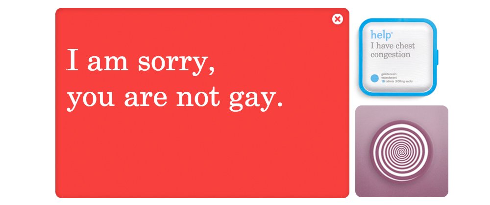 Junto a sus medicinas, en Helpineedhelp.com, aparecen cajas como “Help. I’ve never been kiseed” (Ayuda. Nunca me han besado), “Help. I need to buy a gift for someone” (Ayuda. Necesito comprar un regalo), “Help. I don’t know if I am gay” (Ayuda. No sé si soy homosexual)…