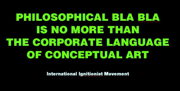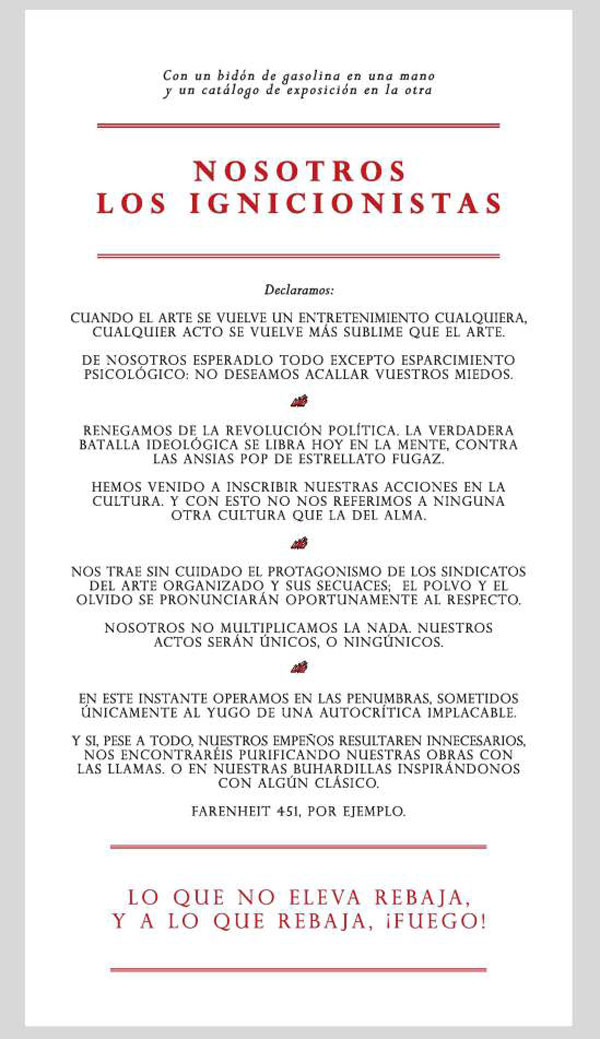 Molinari escribió su conclusión sobre el humano que habita hoy la Tierra. Después reflexionó sobre el arte y pensó que, en este mundo, hay una sobreproducción. Entonces escribió el Manifiesto Ignicionista y empezó a llevarlo a escuelas de arte de Europa y América. Los lemas están solo en carteles. “Es importante que lo lean en esos centros. Es guerrilla urbana”, explica. “También lo hemos llevado a galerías de arte y hemos colgado los pósters en el baño. Te sientas en el inodoro y tienes 2 minutos para leerlo en paz. Además, tenemos un plan futuro de hacer un festival donde los asistentes puedan llevar las obras que no estén a la altura y quemarlas”.