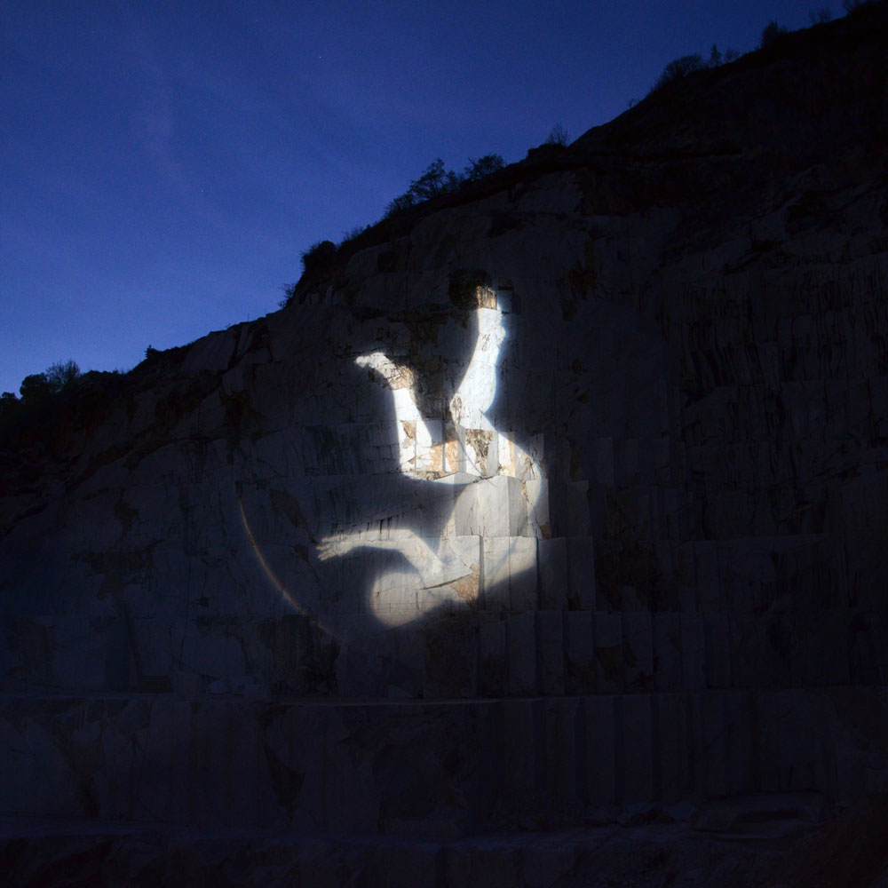 El proyecto consta de estas piezas, diseñadas para interior, y una performance, llevada a cabo a finales del pasado abril, en la que varias figuras caían, en la oscuridad de la noche, sobre las históricas canteras de Colonnata y los Alpes Apuanos. “Estas imágenes, proyectadas en los momentos exactos de la acción que precede a la caída (a la inevitable herida, al daño potencial, encerrado y proyectado en piedra), eran visibles a gran distancia, desde las carreteras de acceso, desde la autopista, desde los pueblos cercanos. Eran el recuerdo del impacto que precede a nuestra inevitable caída: disolvieron definitivamente el paisaje, para volar la montaña por los aires si hace falta, para usarla no como género de representación, sino para cuestionarla como medio para conseguir un fin personal”.