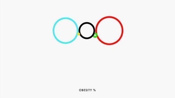 Tres arriba y dos abajo, entrelazados y del mismo tamaño. Los anillos olímpicos llevan casi un siglo mostrándose de esa manera. Dicen que cada uno de ellos representa a uno de los cinco continentes (aunque, al parecer, el COI no acaba de aceptar esta teoría). Pero ¿y si los aros no solo los representase sino que sirvieran para comparar los continentes entre sí en función de, por ejemplo, el porcentaje de obesos entre su población o el de hogares afectados por el SIDA? ¿Cómo sería, entonces, cada anillo?