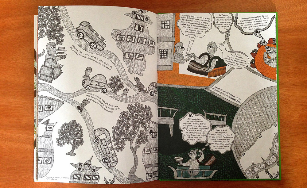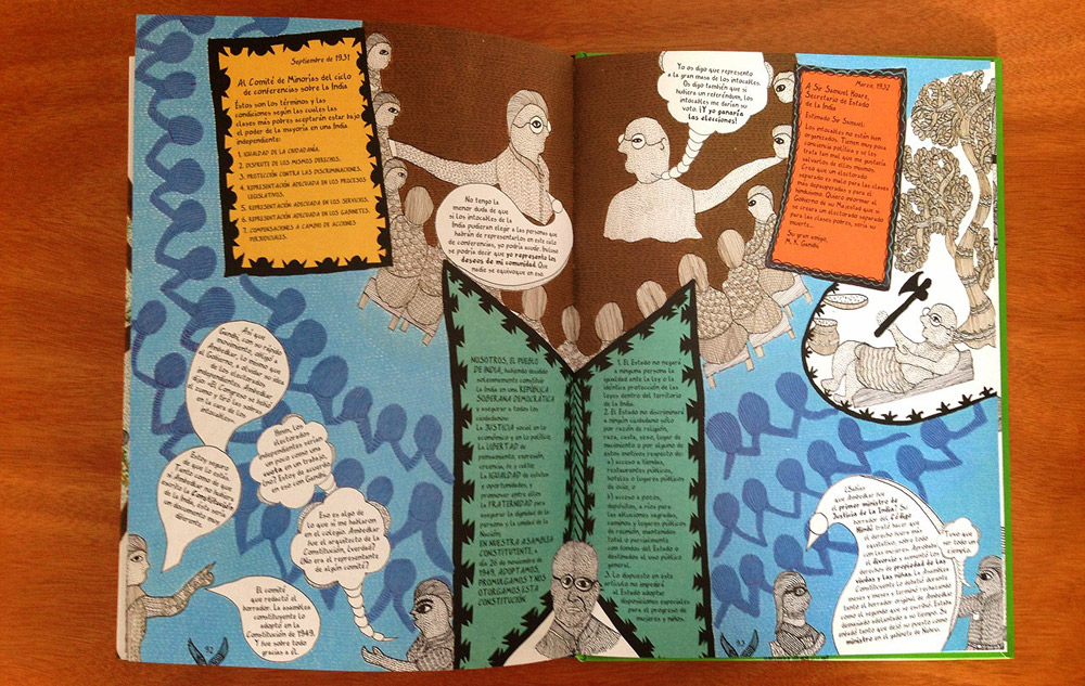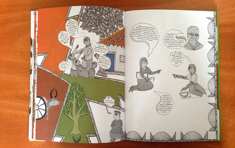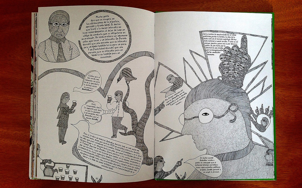 Esos círculos están guardados en un libro titulado Bhimayana, Experiencias de un intocable, de la editorial Sexto Piso, que relata historias dibujadas de la India. Una India en ilustraciones que no continúa la tradición del cómic ni de la novela gráfica. Una India que no sigue una línea recta en el tiempo ni salta en códigos de guionista occidental. Una India donde el sistema de castas se blindó ante la meritocracia y donde el 14 de abril de 1891 nació, después de otros 13 hijos, Bhim Ambedkar.