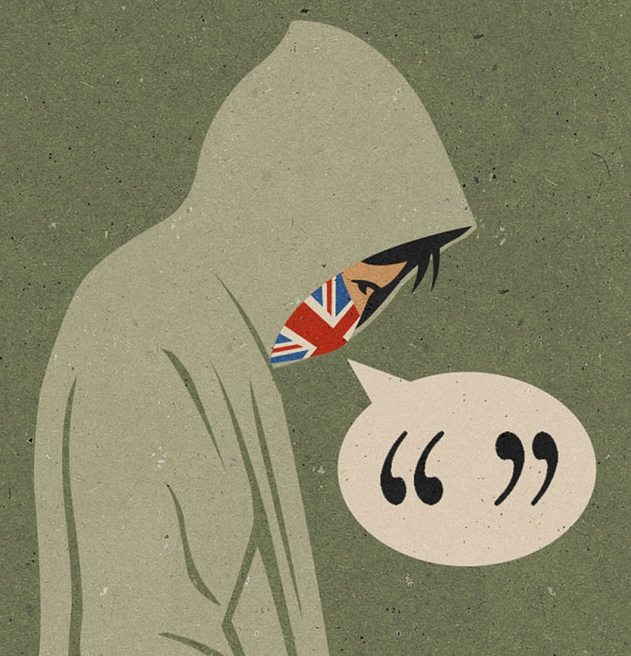 Imagen que representa la forma de hablar de los jóvenes en el Reino Unido. Este dibujo hace referencia a la palabra ‘bally’, un término que, en jerga juvenil, significa ‘máscara’.