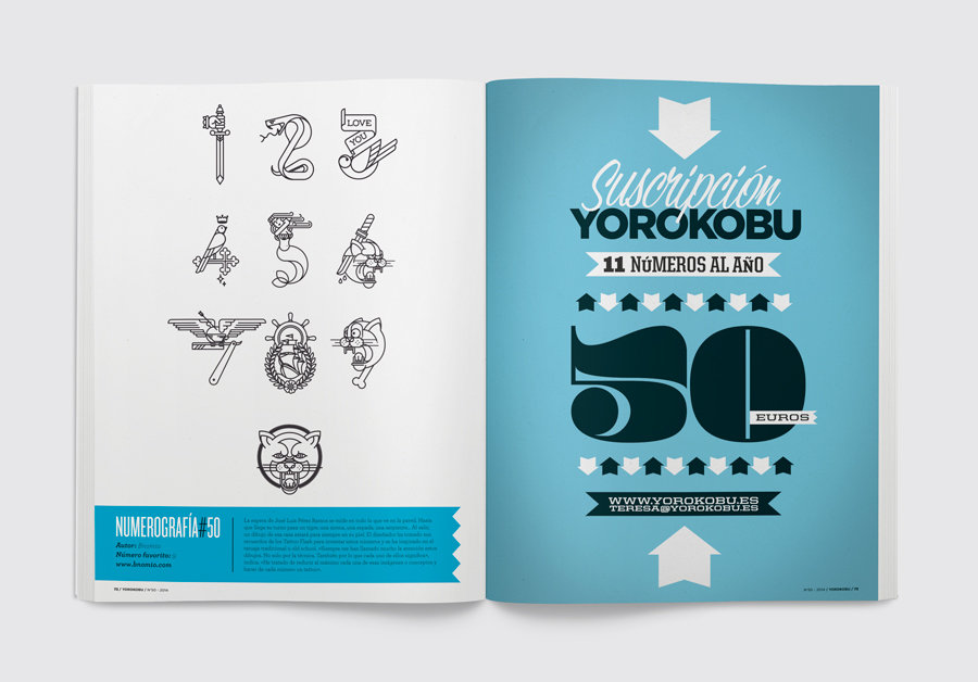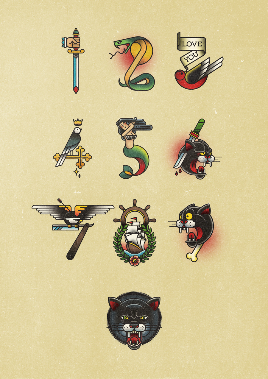 El diseñador ha tomado sus recuerdos de los Tattoo Flash para inventar estos números, publicados en la sección de Numerografía de Yorokobu Abril, y se ha inspirado en el tatuaje tradicional u old school. «Siempre me han llamado mucho la atención estos dibujos. No solo por la técnica. También por lo que cada uno de ellos significa», indica. «He tratado de reducir al máximo cada una de esas imágenes o conceptos y hacer de cada número un tattoo».