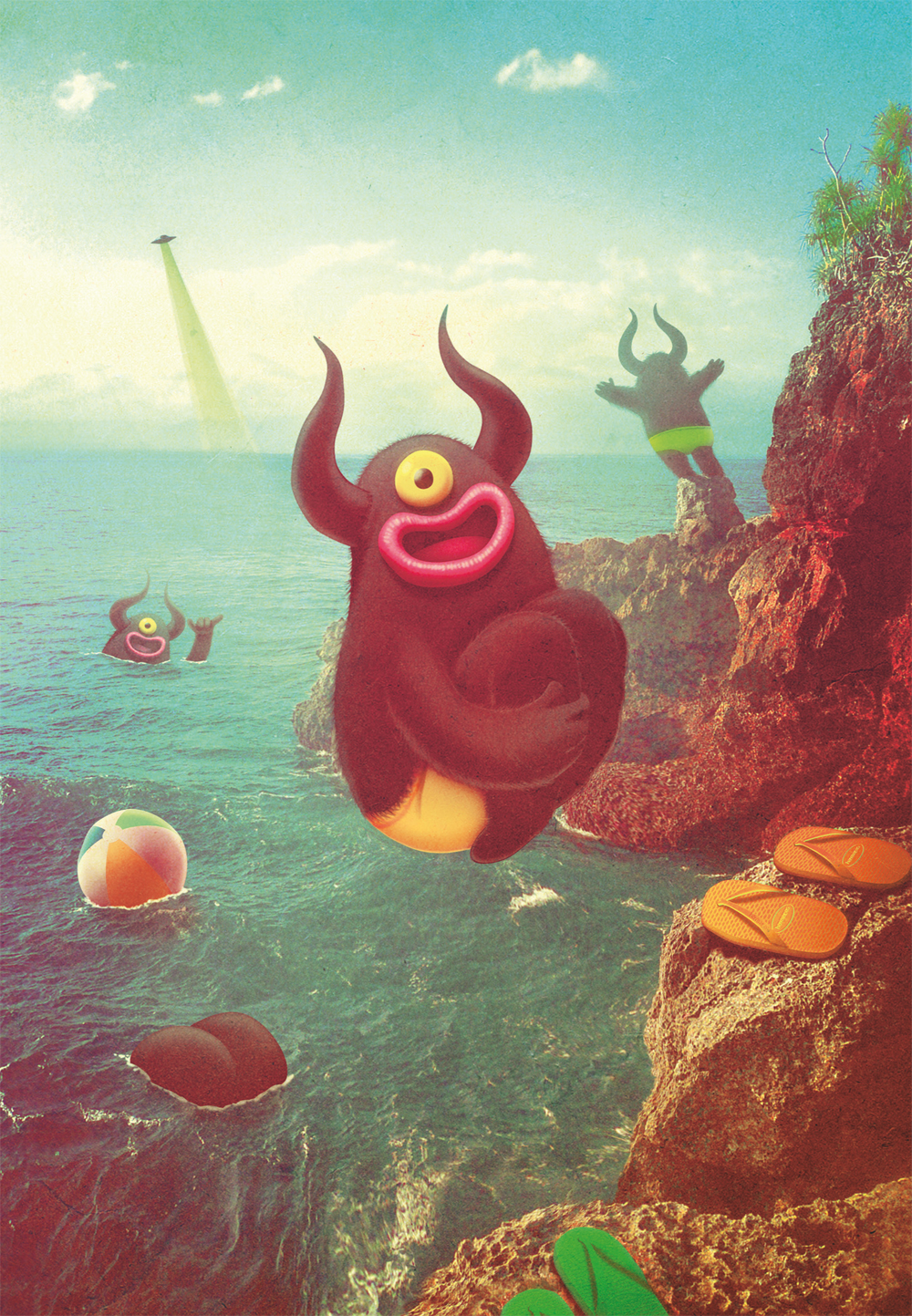 Juan Carlos Bakea es el encargado de ilustrar este concepto. En la imagen, su característico monstruito, que recuerda al trabajo más conocido de Maurice Sendak, se tira en bomba a una caleta de roca. Detrás, un colega peludo se lanza haciendo el ángel mientras otros dos esperan en el agua y uno bucea enseñando el culo. En primer plano, las herramientas que han usado para llegar hasta un lugar tan escondido: unas havaianas verdes y amarillas, curiosamente la bandera de Brasil.