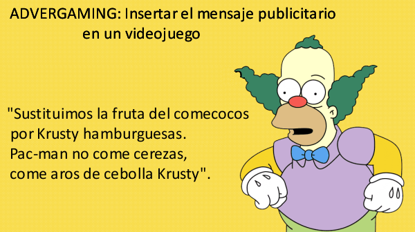 Suena el móvil y Krusty responde. «Perdona, chaval, era mi agente: he cerrado otro negocio» dice Krusty. No pregunto; intuyo que me lo dirá. «He conseguido que las distintas variedades de Krusty Burger aparezcan en el comecocos: esa es otra forma de hacer publicidad, se llama advergaming».